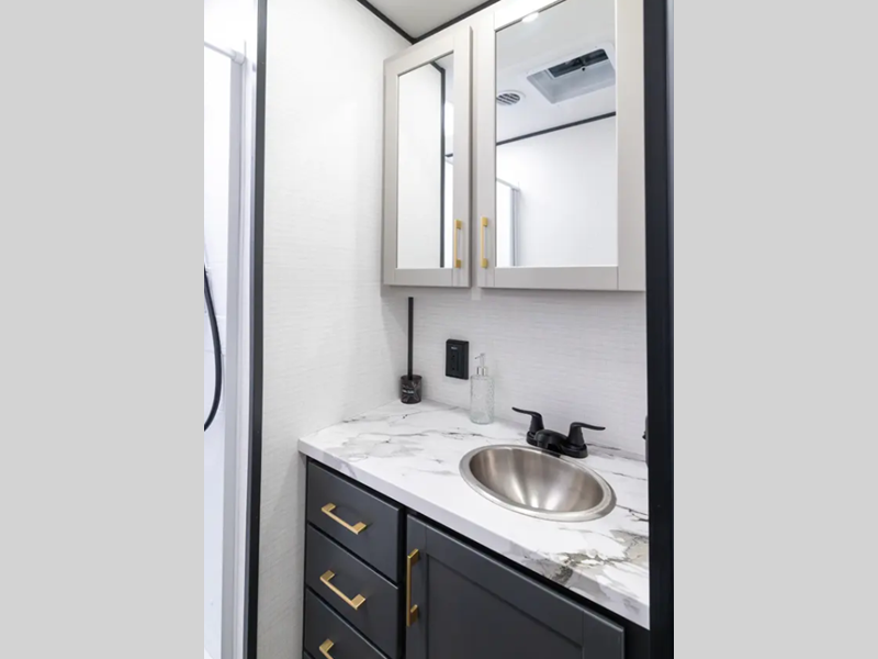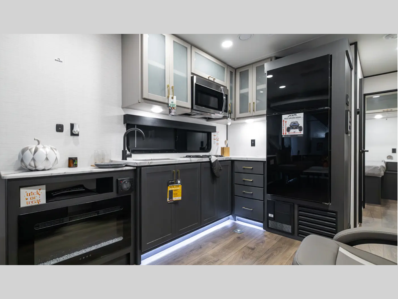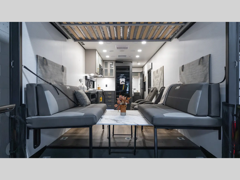 There is a rear beaver tail frame, a docking station, and a magnetic screen wall so you can let the fresh air in without letting the bugs in. You will feel right at home with decorative kitchen backsplash and LED lights, and there is a tankless water heater to provide endless hot showers after trail riding. The Alumifoil insulated enclosed underbelly will help extend your camping season, and the patio railing kit will let you enjoy more time outdoors once the toys are unloaded.