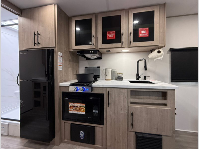 The gel coated fiberglass exterior is sure to turn heads at the campsite, and the spare tire and carrier will come in handy. You will also love the four included packages, such as the AIM Solar Package with off-grid features and the AIM Four Seasons Protection Package to keep you comfortable on camping trips!