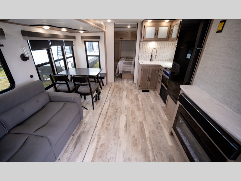 Sleeps 4 Slides 2 Length 33 ft 7 in Ext Width 8 ft Ext Height 11 ft 5 in Int Height 6 ft 8 in Hitch Weight 940 lbs Dry Weight 7390 lbs Cargo Capacity 2350 lbs Fresh Water Capacity 23 gals Grey Water Capacity 33 gals Black Water Capacity 33 gals Furnace BTU 35000 btu Available Beds Queen Refrigerator Type 12V Refrigerator Size 10.7 cu ft Cooktop Burners 3 Number of Awnings 1 LP Tank Capacity 20 lbs Water Heater Type Tankless AC BTU 13500 btu Awning Info Electric w/LED Lights Axle Count 2 Number of LP Tanks 2 Shower Type Standard Electrical Service 30 amp Similar Floorplans