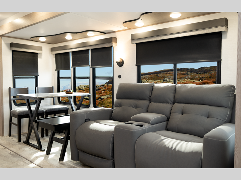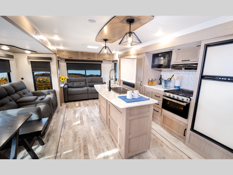 Sleeps 4 Slides 3 Length 37 ft 7 in Ext Width 8 ft Ext Height 11 ft 5 in Int Height 6 ft 8 in Hitch Weight 1530 lbs Dry Weight 9190 lbs Cargo Capacity 1540 lbs Fresh Water Capacity 35 gals Grey Water Capacity 33 gals Black Water Capacity 34 gals Furnace BTU 35000 btu Available Beds King Refrigerator Type 12V Refrigerator Size 10.7 cu ft Cooktop Burners 3 Number of Awnings 1 LP Tank Capacity 20 lbs Water Heater Type Tankless AC BTU 13500 btu Awning Info Electric w/LED Lights Axle Count 2 Number of LP Tanks 2 Shower Type Standard Electrical Service 30 amp Similar Floorplans
