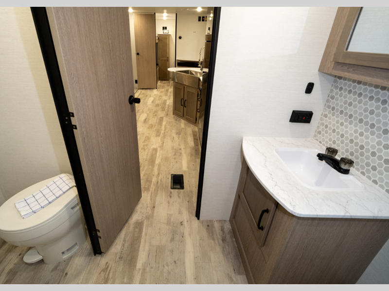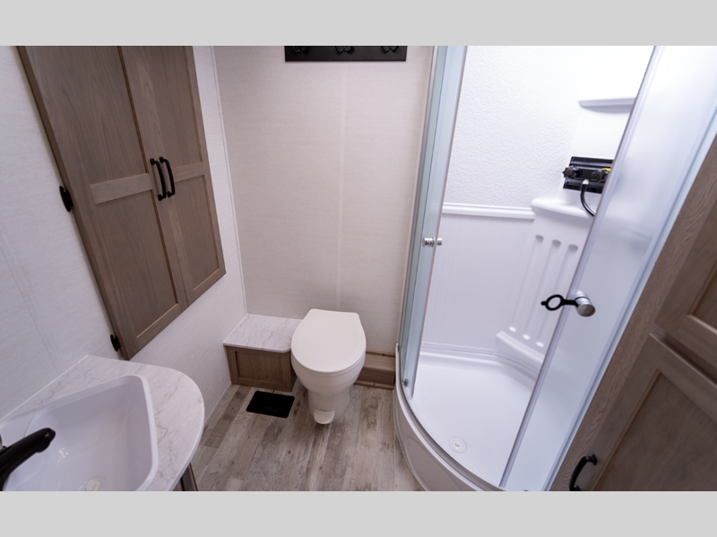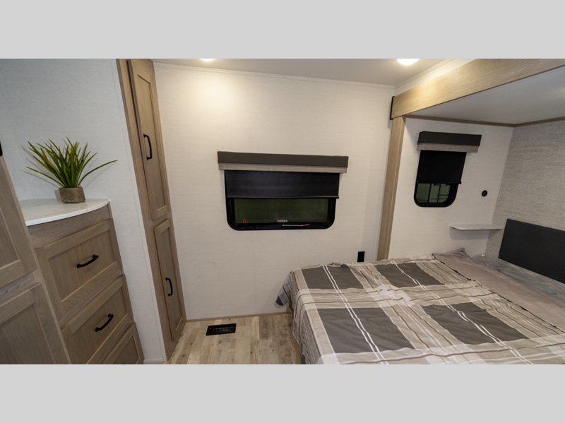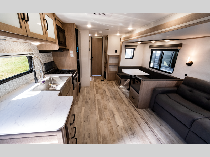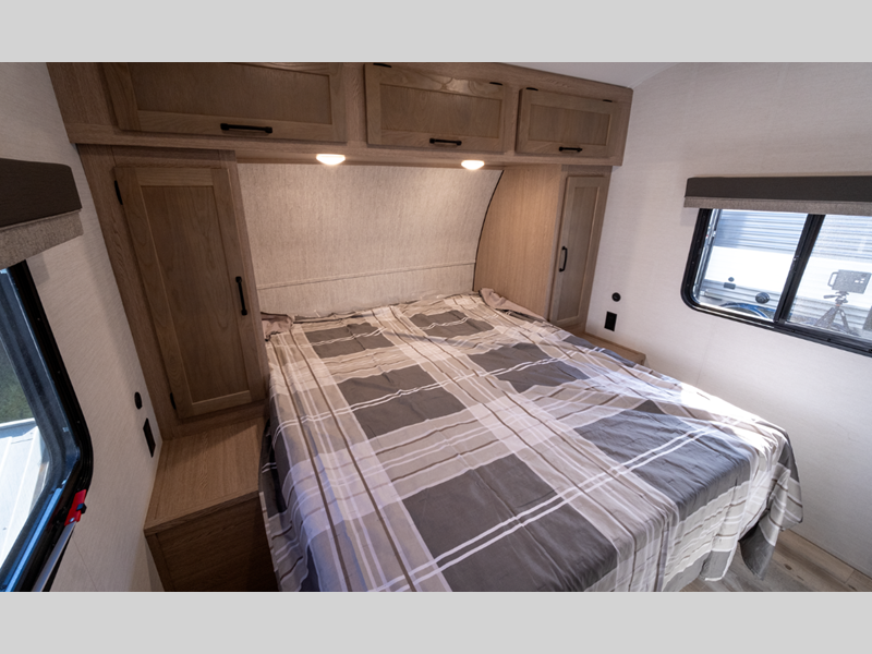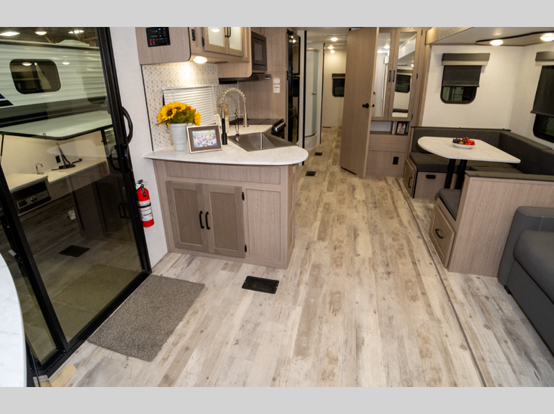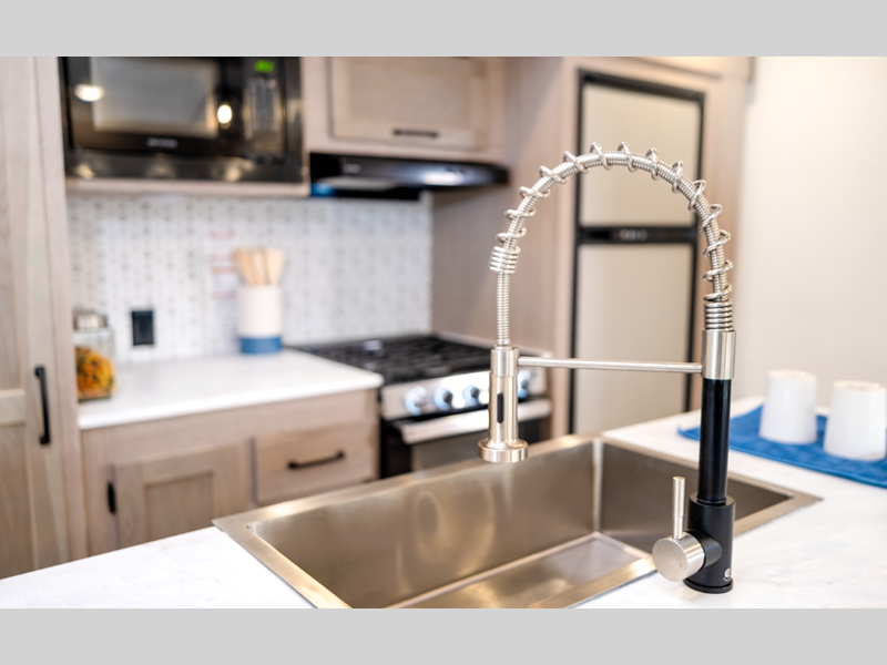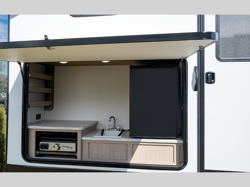 There is generous storage space throughout, large picture windows to let in beautiful views, and stylish handcrafted cabinetry. You will love upgraded graphics that is sure to turn heads as you enter the campground, and the lighted storage area will make unpacking easier than ever. The included Supreme Package includes a tankless water heater, an electric awning with LED lights, designer backsplash, solar prep, and many more convenient amenities.