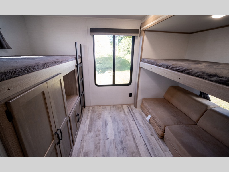 Sleeps 8 Slides 2 Length 36 ft 5 in Ext Width 8 ft Ext Height 11 ft 7 in Int Height 6 ft 8 in Hitch Weight 980 lbs Dry Weight 8050 lbs Cargo Capacity 1730 lbs Fresh Water Capacity 35 gals Grey Water Capacity 33 gals Black Water Capacity 33 gals Furnace BTU 30000 btu Number Of Bunks 3 Available Beds Queen Refrigerator Type 12V Refrigerator Size 10.7 cu ft Cooktop Burners 3 Number of Awnings 1 LP Tank Capacity 20 lbs Water Heater Type Tankless AC BTU 13500 btu Awning Info Electric w/LED Lights Axle Count 2 Number of LP Tanks 2 Shower Type Tub/Shower Combo Electrical Service 30 amp Similar Floorplans