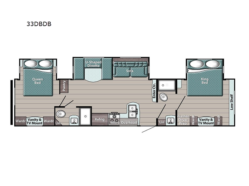 Sleeps 9 Slides 2 Length 33 ft Ext Width 8 ft Ext Height 10 ft 9 in Int Height 6 ft 8 in Hitch Weight 910 lbs Dry Weight 6660 lbs Cargo Capacity 1820 lbs Fresh Water Capacity 35 gals Grey Water Capacity 67 gals Black Water Capacity 33 gals Furnace BTU 30000 btu Number Of Bunks 2 Available Beds Queen Refrigerator Type 12V Refrigerator Size 10.7 cu ft Cooktop Burners 3 Number of Awnings 1 LP Tank Capacity 20 lbs Water Heater Type Tankless AC BTU 13500 btu Awning Info Electric w/LED Lights Axle Count 2 Number of LP Tanks 2 Shower Type Tub/Shower Combo Electrical Service 30 amp Similar Floorplans