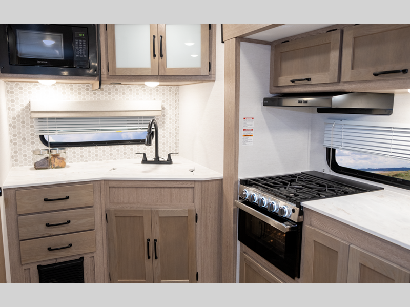 Each model includes craft-made cabinetry, high-performance vinyl flooring throughout, and laminated countertops with coordinated molding for a more residential feel. Some of the features you'll find in the Lite Value Package are the four stabilizer jacks, the Bluetooth radio with two interior and two exterior speakers, designer backsplash in the kitchen, plus multiple tech-ready available upgrades for added convenience.