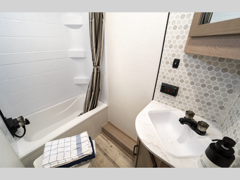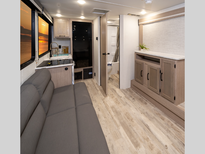 Sleeps 5 Slides 1 Length 23 ft 4 in Ext Width 8 ft Ext Height 10 ft 6 in Int Height 6 ft 8 in Hitch Weight 530 lbs Dry Weight 4430 lbs Cargo Capacity 1300 lbs Fresh Water Capacity 35 gals Grey Water Capacity 34 gals Black Water Capacity 34 gals Furnace BTU 20000 btu Number Of Bunks 2 Available Beds Queen Refrigerator Type Everchill Refrigerator/Freezer Refrigerator Size 10.7 cu ft Cooktop Burners 3 Number of Awnings 1 LP Tank Capacity 20 lbs Water Heater Type Tankless AC BTU 13500 btu Awning Info Electric with LED Lights Axle Count 2 Number of LP Tanks 1 Shower Type Tub/Shower Combo Electrical Service 30 amp Similar Floorplans