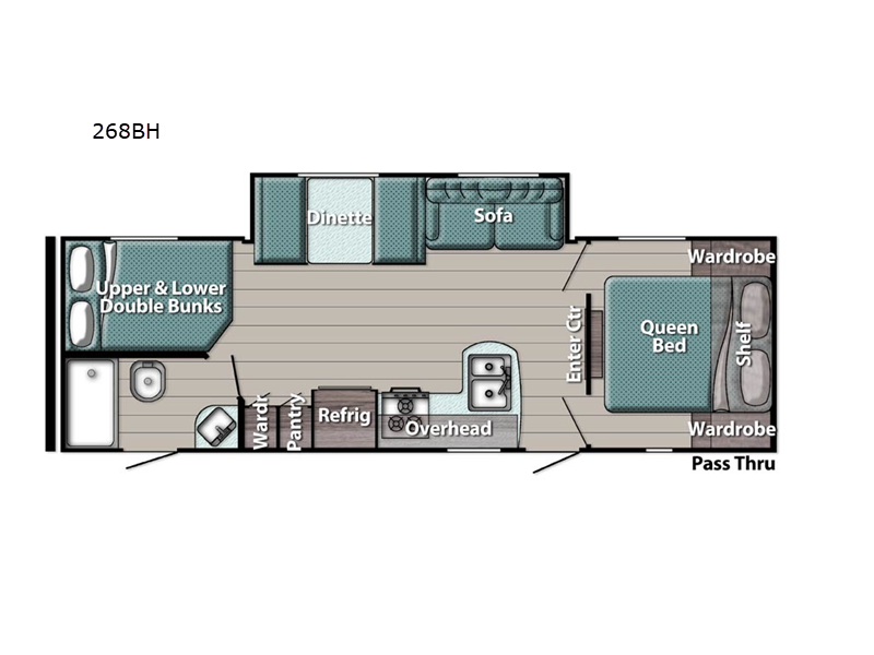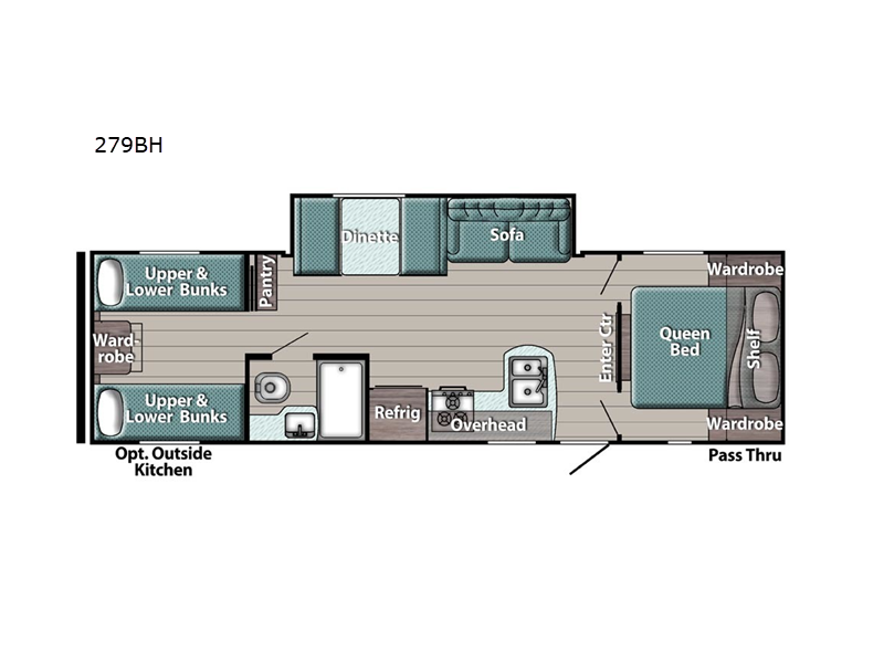 Sleeps 9 Slides 1 Length 29 ft 6 in Ext Width 8 ft Ext Height 11 ft 1 in Int Height 6 ft 8 in Hitch Weight 660 lbs Dry Weight 5177 lbs Cargo Capacity 2483 lbs Fresh Water Capacity 23 gals Grey Water Capacity 33 gals Black Water Capacity 34 gals Tire Size 14" Furnace BTU 20000 btu Number Of Bunks 2 Available Beds Queen Refrigerator Type Everchill Refrigerator/Freezer Refrigerator Size 10.7 cu ft Cooktop Burners 3 Number of Awnings 1 LP Tank Capacity 20 lbs Water Heater Type Tankless AC BTU 13500 btu Awning Info Electric with LED Lights Axle Count 2 Number of LP Tanks 2 Shower Type Standard Electrical Service 30 amp Similar Floorplans