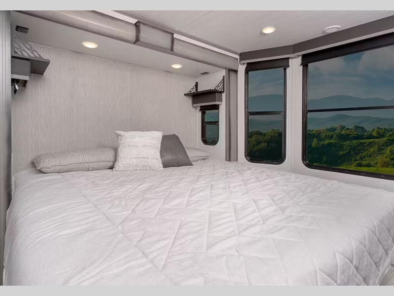 Sleeps 7 Slides 3 Length 40 ft 11 in Ext Width 8 ft 6 in Ext Height 13 ft 5 in Interior Color Cottage White Hitch Weight 1405 lbs Dry Weight 13018 lbs Cargo Capacity 982 lbs Fresh Water Capacity 53 gals Grey Water Capacity 39 gals Black Water Capacity 39 gals Tire Size ST235/85R16F Available Beds King Refrigerator Size 15 cu ft Cooktop Burners 3 LP Tank Capacity 30 lbs Axle Count 2 Number of LP Tanks 2 Shower Type Radius Similar Floorplans
